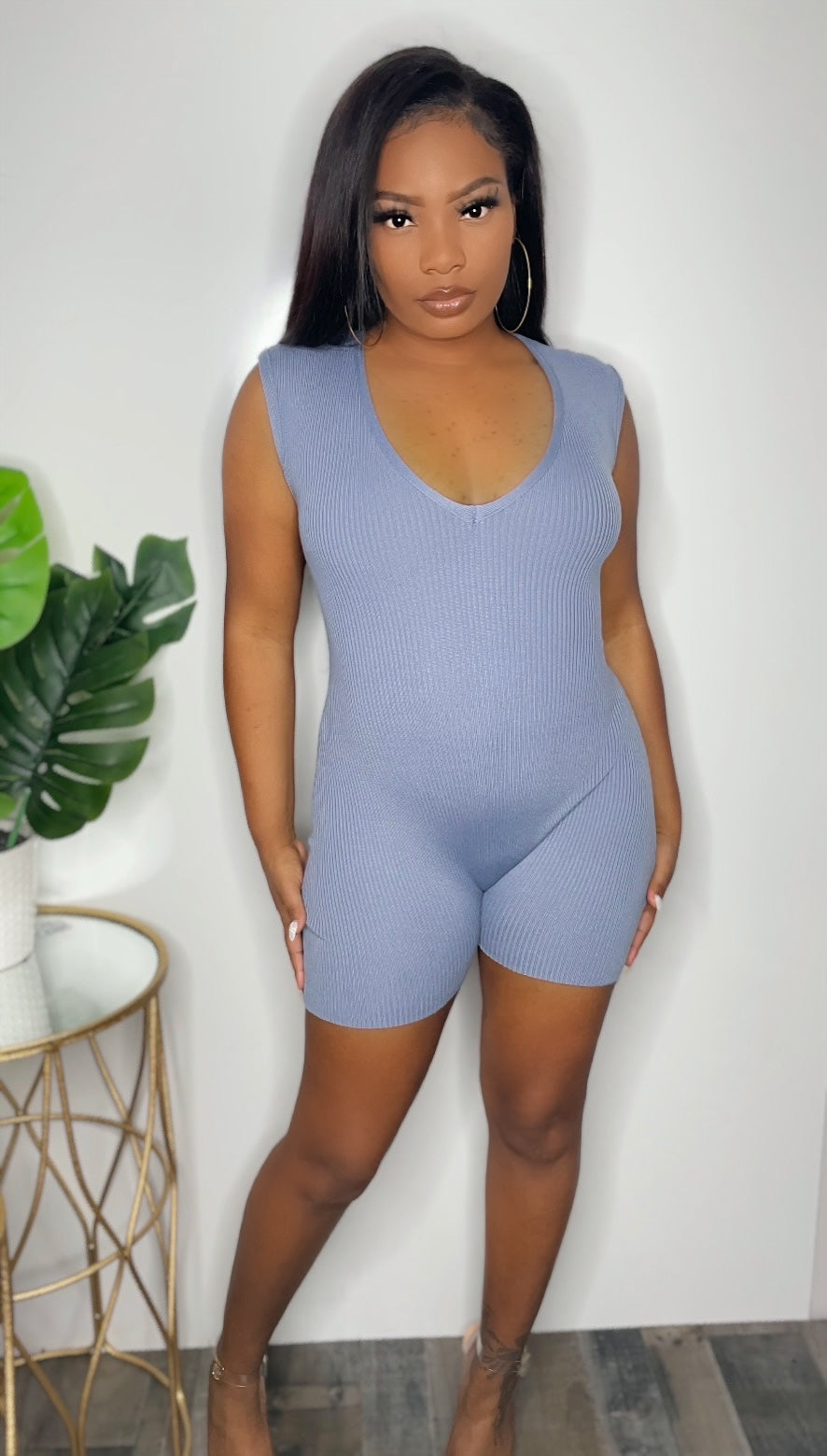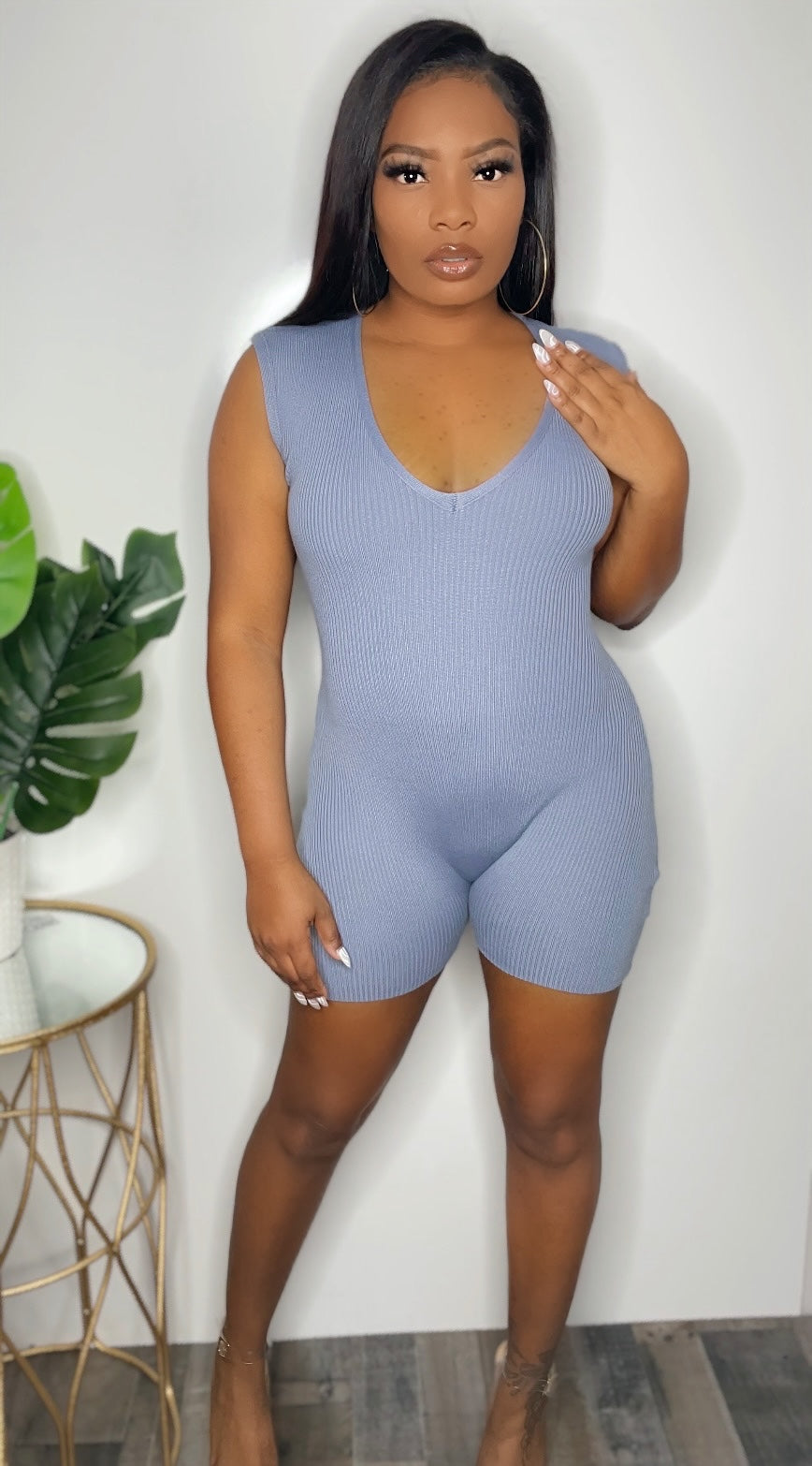 RIBBED KNIT TEXTURE DEEP V-NECK ROMPER.